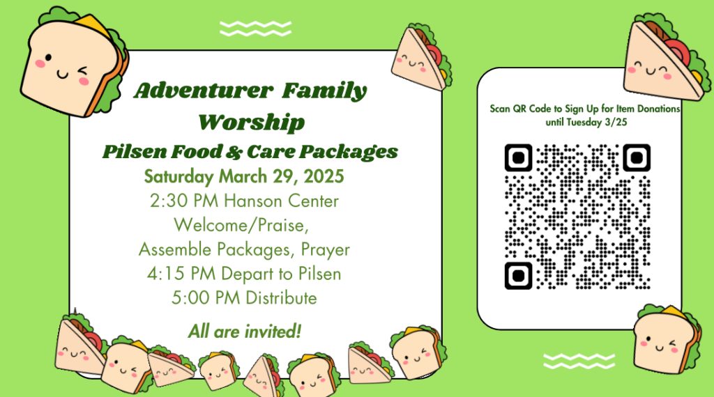 Join the Adventurers as they do a service project to help those in need in Pilsen. They will meet at the Hansen Center at 2:30 pm for worship and packing goods. Then will depart for Pilsen at 4:15 pm. This is in collaboration with Pilsen Adventurer Club. To sign up for item donation click here and for more information contact Pastor Rodney.