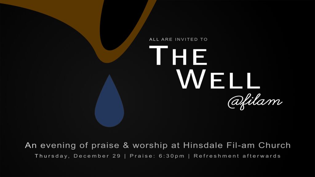 - Thursday, Dec 29 | 6:30pm | The Well (Night of Worship). Come join an evening of praise and worship led by several youth and young adults! Refreshments provided. All are invited!
