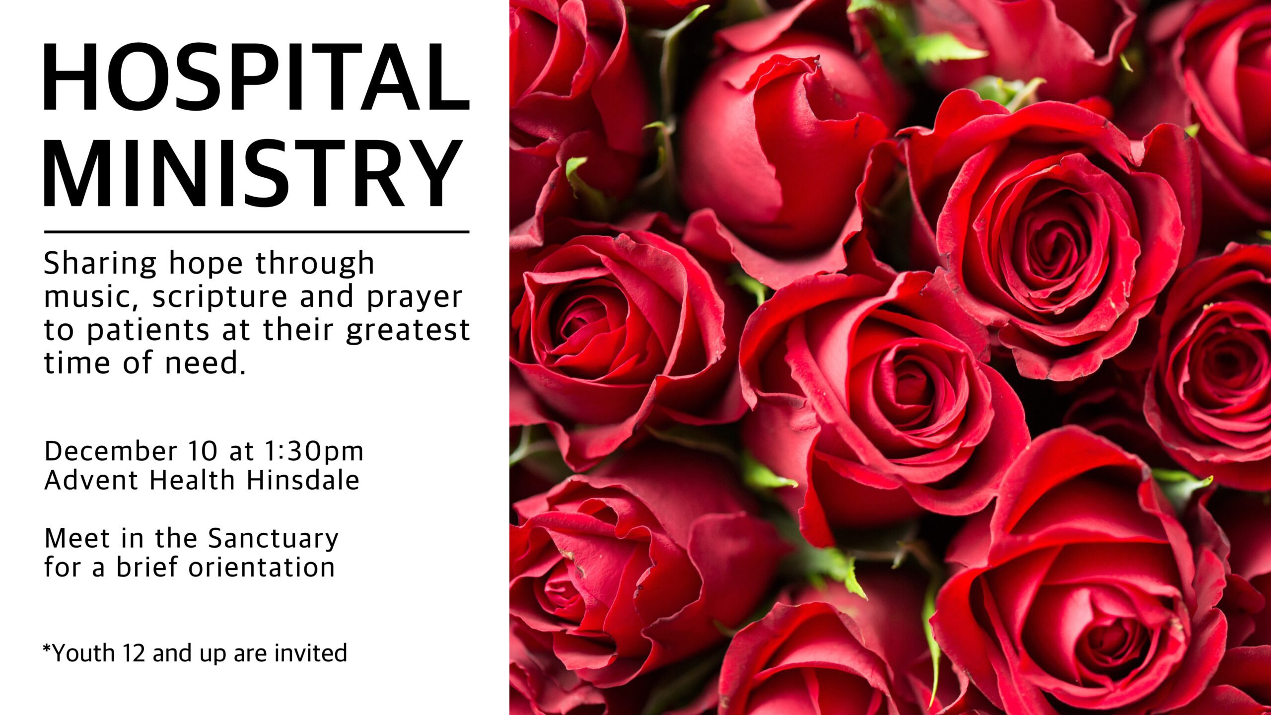 - Hospital Ministry on Saturday, December 10th at 1:30pm! God has opened the doors for us to minister to patients in the hospital by their bedside! All youth 12 and up are invited to share hope through music, scripture and prayer to patients at their greatest time of need. For more information, contact Pastor Rodney.