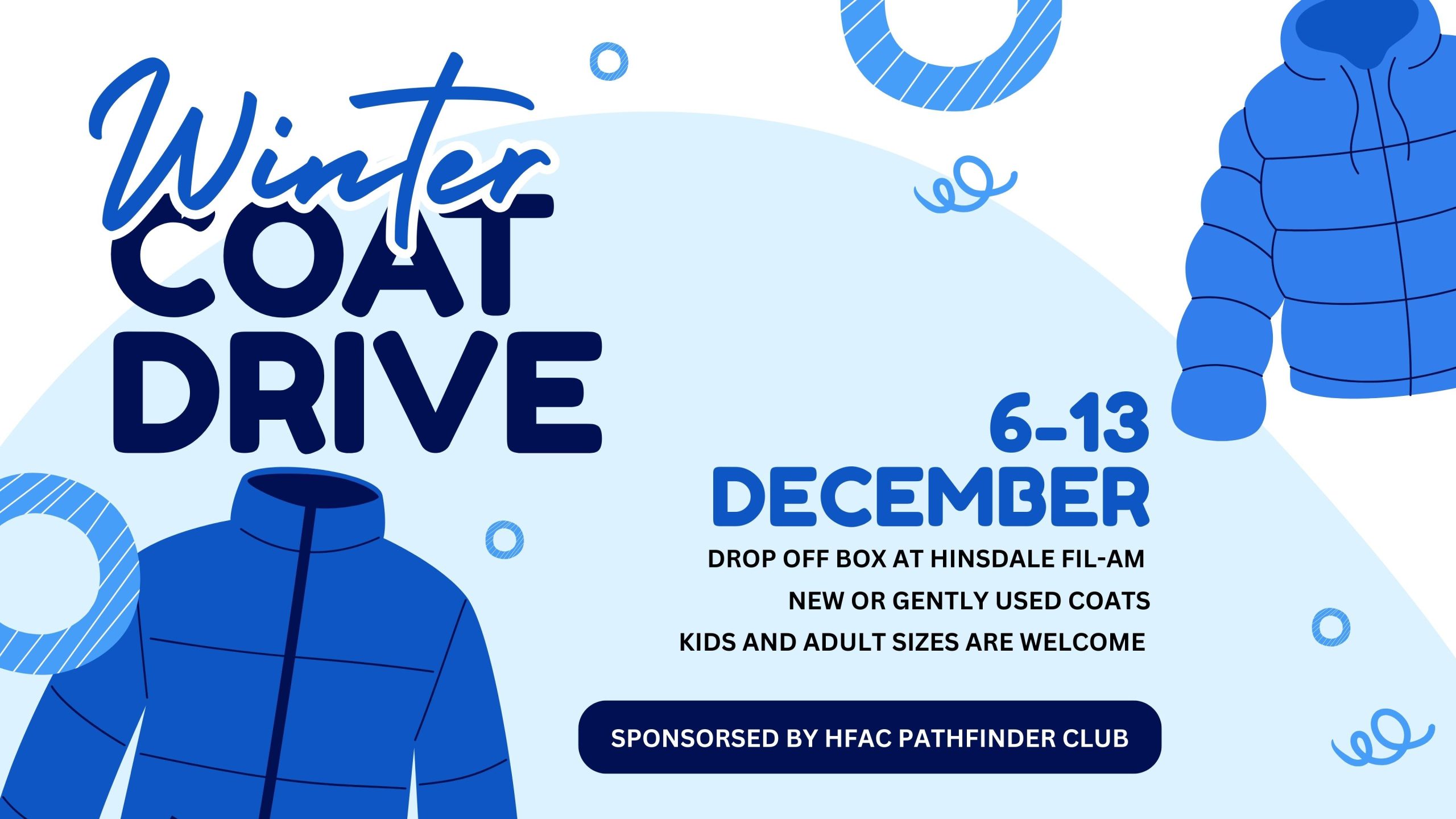 We are calling all members and visitors to donate new or gently used coats to be given to the One Warm Coat Organization now until December 13. You can drop off your coats in the donation box located the hallway of our church. Sponsored by the Hinsdale Fil-am Pathfinder Club. Thank you for helping those in need!