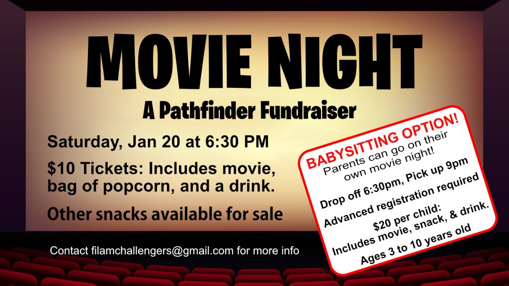 All ages 3-10 are invited to a movie night held in the fellowship hall. All proceeds will help raise funds for International Camporee. Contact filamchallengers@gmail.com for more info.