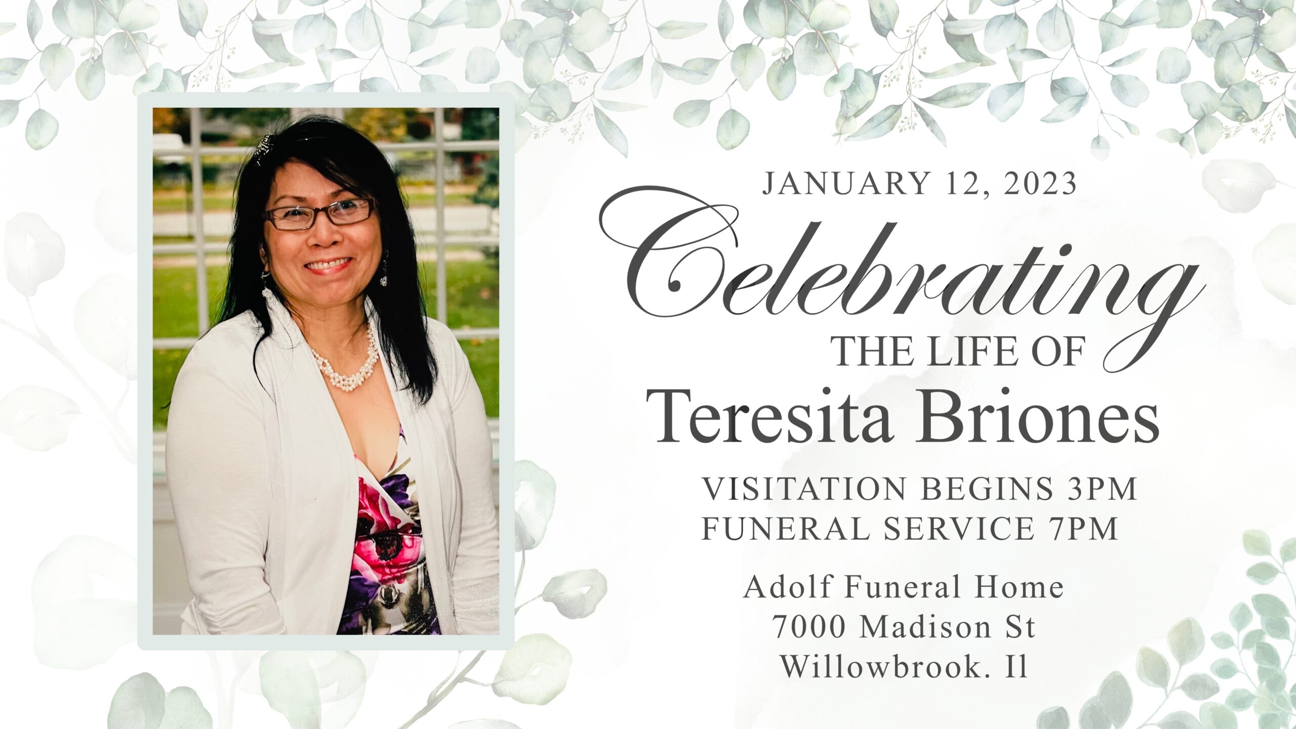 • Funeral Service for Teresita Briones on Thursday, Jan 12th. Join us as we remember and celebrate the life of Teresita Briones (James Garcia’s mother). Viewing begins at 3pm and the program starts at 7pm. Address: Adolf Funeral Home – 7000 Madison St. Willowbrook, IL.