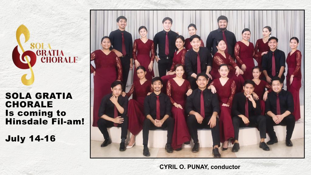 - The Sola Gratia Chorale is a singing ministry out of the Adventist University of Philippines, established in 2019 under the direction of Mr. Cyril Punay. Come hear their beautiful voices and mission-minded testimonies as they share with our church during this special weekend! More details on their concert to come!