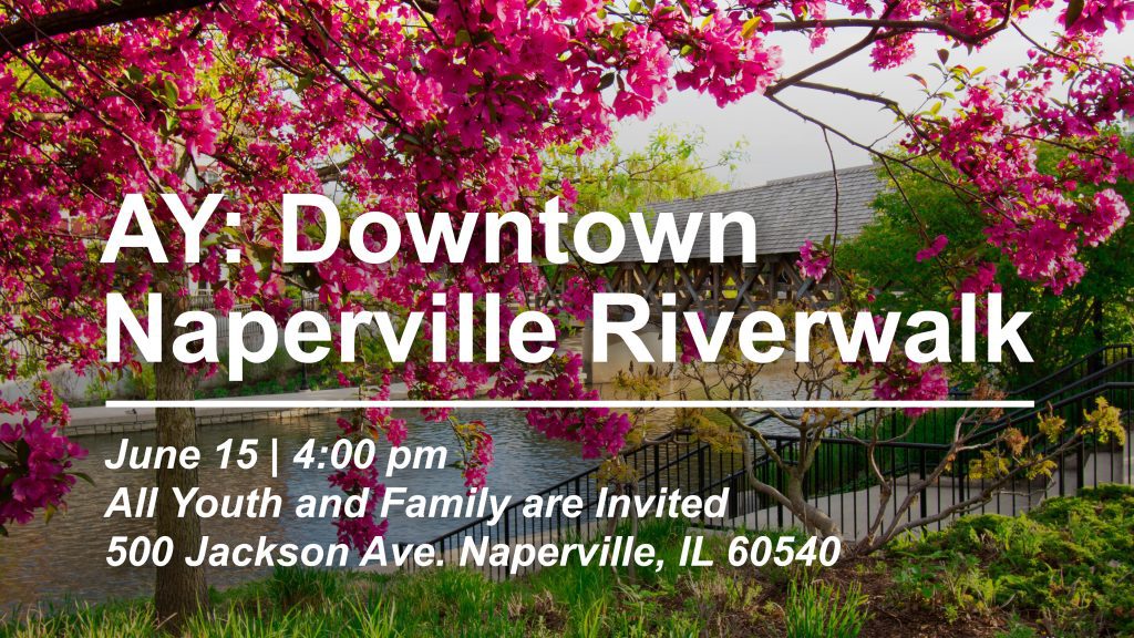 Join us as we kick off our Youth Summer Program with AY at Downtown Naperville Riverwalk. Let’s enjoy the beautiful day and worship together! We will meet at the Riverwalk Park. All parents and youth please bring comfortable shoes for walking, a char or something to sit on and a Bible for worship. For more information, contact Pastor Rodney.