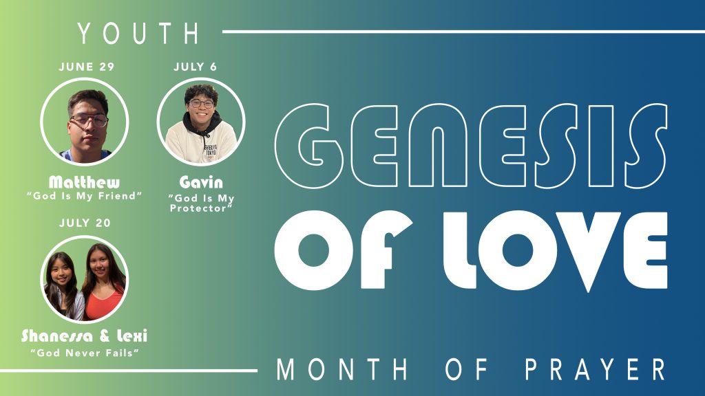 For the month of July join us as we come together as a youth learning about God’s love through the book of Genesis. All middle and high school age and their parents are welcome to join!