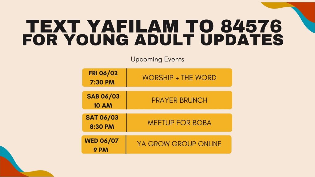- All collegiate and young adults can text YAFILAM to 84576 to stay up to date on all upcoming events.