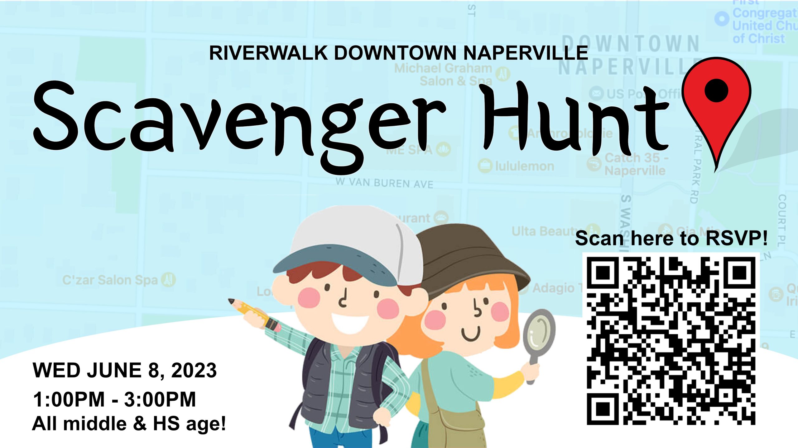 - Join us for a scavenger hunt around Riverwalk Downtown Naperville! All middle school and high school youth are invited! Come for fun and receive prizes! For more information, contact Pastor Rodney at rblames@ilcsda.org.