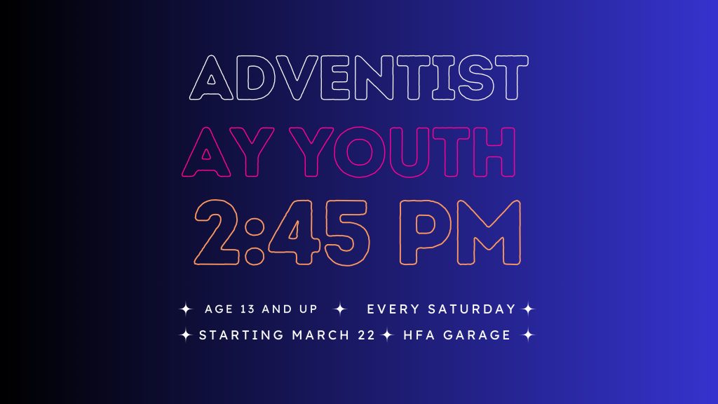 Exciting news from our Youth Ministry! We are bringing back AY every Sabbath at 2:45 pm in the garage. All ages 13 and up are welcome to join us. Our aim is to build relationships with each other and with God. For more information contact Pastor Rodney.