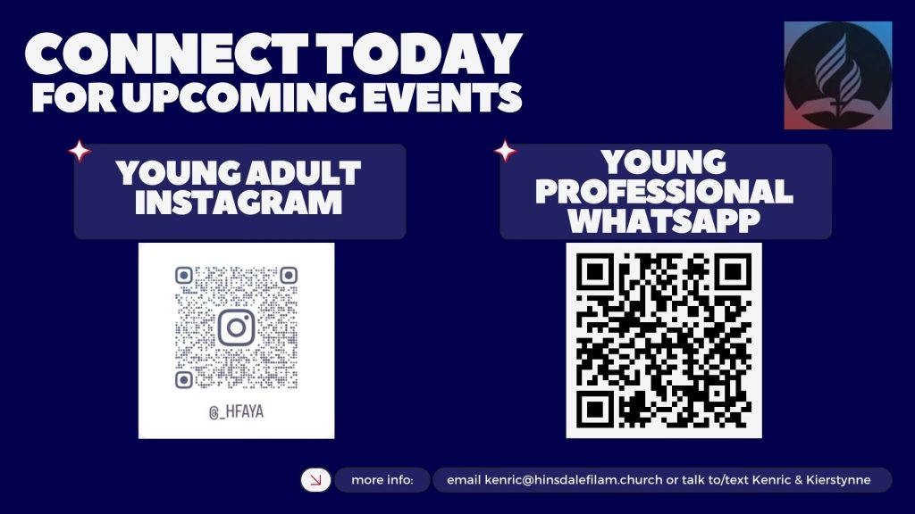 Calling all young adults! Scan the QR code above to stay up to date with all things young adult related! For more information, contact Kenric of Kierstynne.