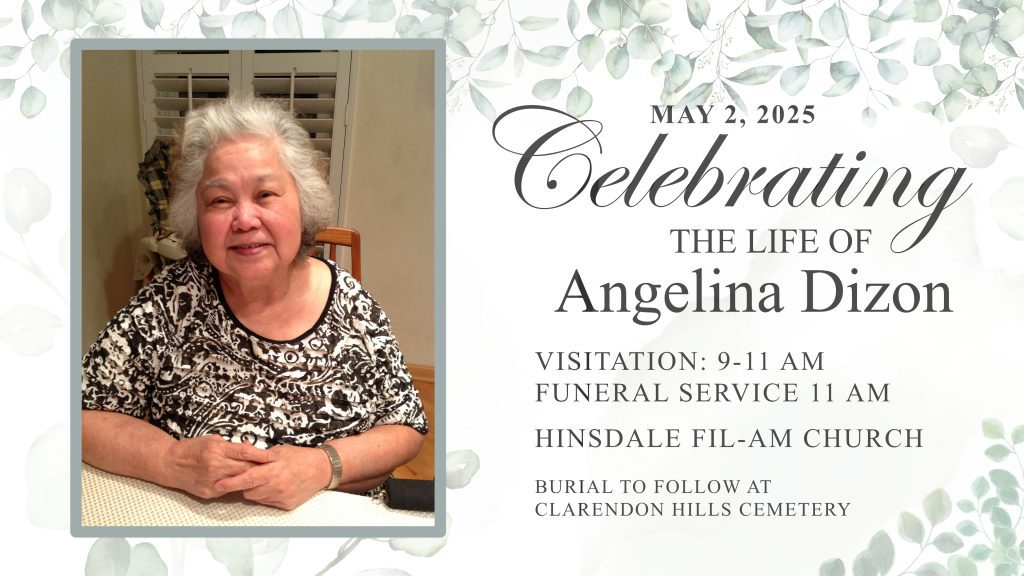 We will celebrate the life of Angelina Dizon (Deleon Family) on Friday May 2. Visitation will began today from 9-11am and Funeral Service at 11am at Hinsdale Fil-am Church. Burial to follow at Clarendon Hills Cemetery. Let us continue to pray for the Dizon family during their time of loss.
