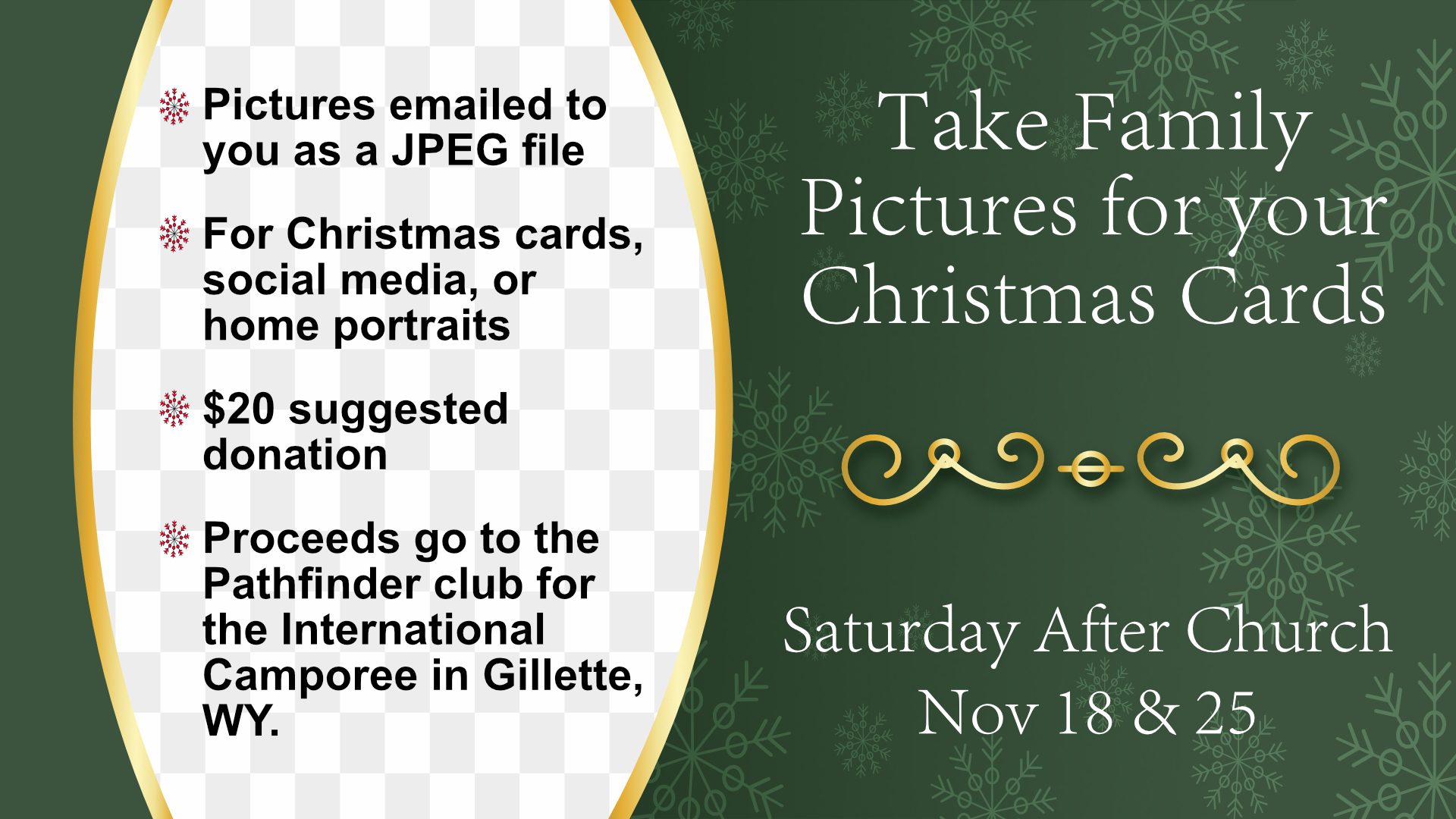 Need a family picture for the Christmas Season? Look no further! On November 25 meet the Pathfinder staff right after church in the Sanctuary to get your photo taken. All proceeds go to the Pathfinder club for the International Camporee in Gillette, WY. Suggested donation is $20.