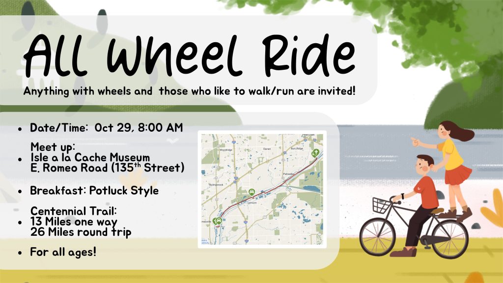 Join us (weather permitting) on Sunday morning for a nice bike ride on Centennial Trail (26 miles round trip). We will meet at Isla a la Cache Museum at 8am for breakfast. All are invited!